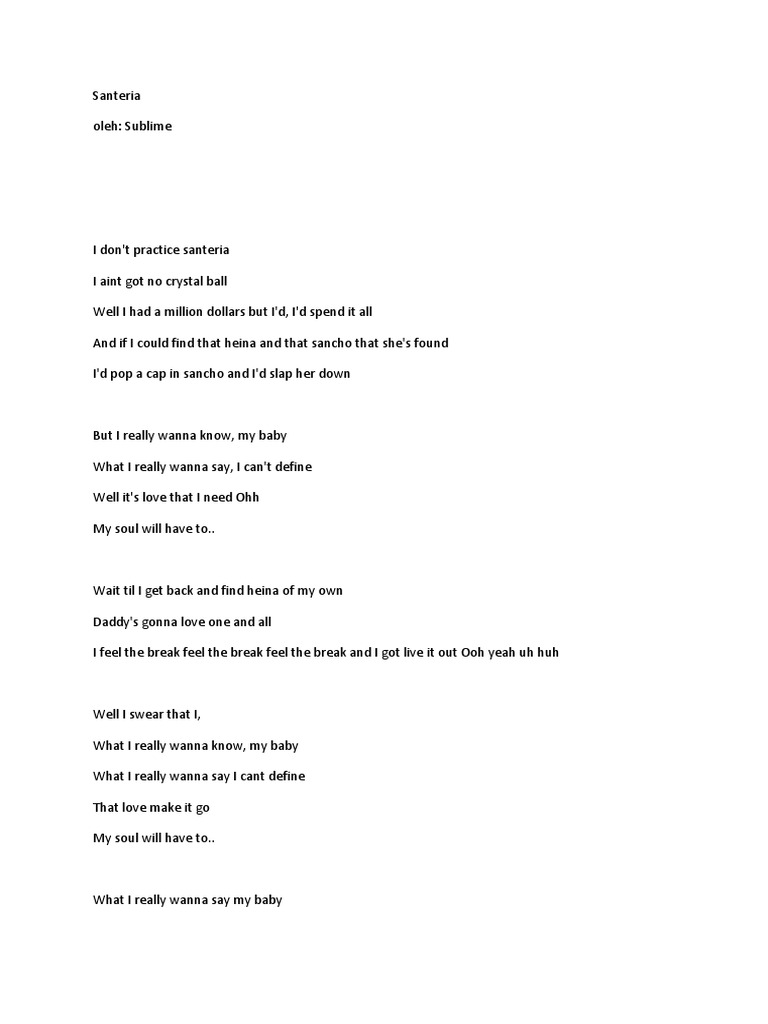 Santeria Sublime Lyrics / This song is by sublime and appears on the album sublime (1996). Santeria Sublime Lyrics / I don't practice santeria i ain't got no crystal ball well, i had a million dollars but i, i'd spend.